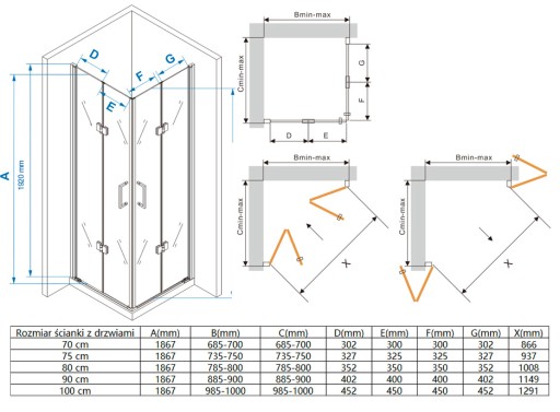 - Ścianka ze składanymi drzwiami: 80 cm