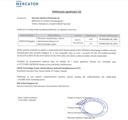 Wyrób ten jest produktem posiadającym wszelkie certyfikaty, zgodnie z najnowszymi wymaganiami regulacyjnymi w zakresie środków ochrony indywidualnej.