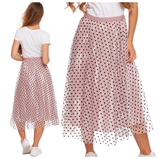 Oczaruj wszystkich tą uroczą różową spódnicą tiulową w delikatne groszki, która łączy w sobie dziewczęcą słodycz z elegancką nutą. Długość spódnicy, sięgająca do połowy łydek (zależnie od wzrostu), sprawia, że jest ona niezwykle uniwersalna i pasuje na różnorodne okazje - od casualowych spotkań po eleganckie wydarzenia. Spódnica została zaprojektowana z myślą o kobietach, które pragną dodać swojemu wyglądowi lekkości i subtelnej gracji.