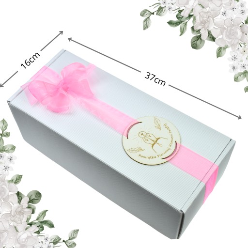 - pudełko, karbowany eco kartonik wypełniony wełną drzewną, wymiary: 37x16x12,5 cm z emblematem przewiązanym tasiemką