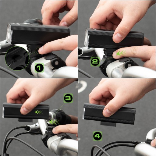 - Do zestawu dołączony jest uchwyt montażowy pod siodełko, który można przymocować za pomocą opaski elastycznej lub zaciskowej (wszystko dołączone do zestawu)