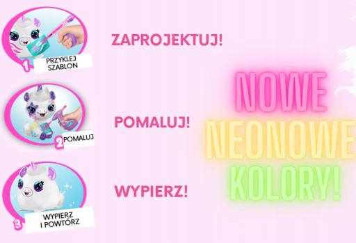 Zestaw ten umożliwia tworzenie wspaniałych neonowych stylizacji i wizerunku na dołączonej do zestawu maskotce-niespodziance. Zabawa jest prosta i wygodna dzięki łatwej w użyciu pompce do malowania i neonowym markerom.
