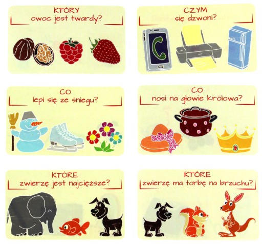 Wesoły quiz rysunkowy. Karty zawiarają rysunkowe odpowiedzi na pytania, dzięki czemu dzieci, które jeszcze nie czytają będą się dobrze bawić
