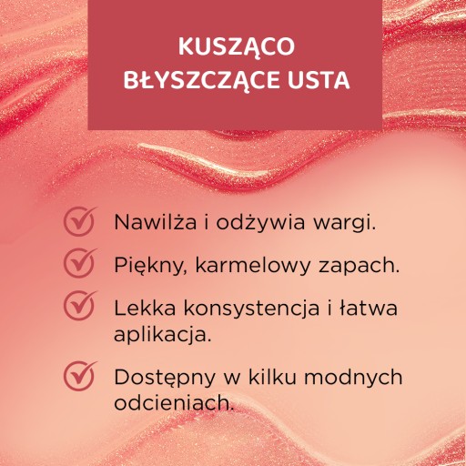 Odczujesz różnicę - Twoje usta staną się pełniejsze, a Ty będziesz mogła cieszyć się komfortem i pewnością siebie. Dodatkowo, smakowity karmelowy zapach błyszczyka to uczta dla zmysłów. Błyszczyk jest dostępny w delikatnych kolorach, od subtelnych odcieni po soczysty róż.