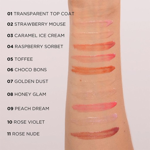 Formuła błyszczyka zapewnia wygodną aplikację i komfortowe noszenie. Wystarczy jedno pociągnięcie, aby zobaczyć na swoich ustach przyciągający wzrok blask! Receptura, bogata w witaminę C i kwas hialuronowy, zatroszczy się o nawilżenie i odżywienie ust. 5 delikatnych kolorów zachwyci różnorodnością. Smakowity karmelowy zapach błyszczyka sprawi, że noszenie go na ustach będzie rozkoszą dla zmysłów!