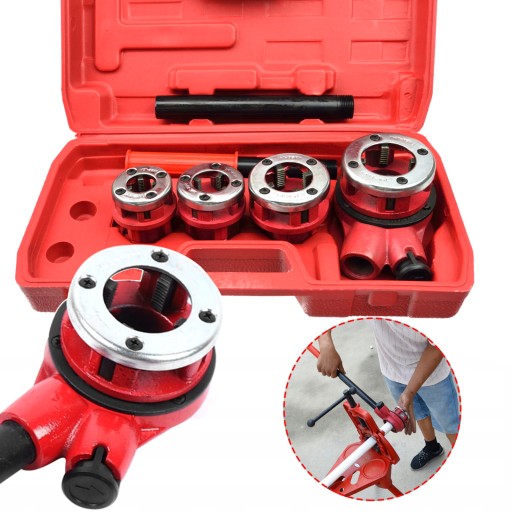 Gwintownica hydrauliczna do rur w zestawie z 4 narzynkami.
