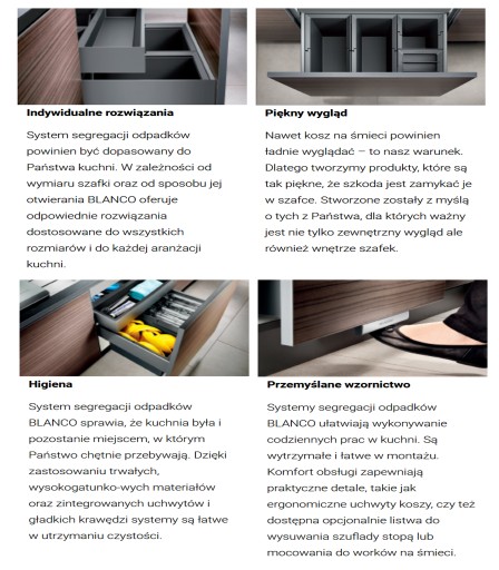 Systemy segregacji odpadów mają na celu optymalne wykorzystanie przestrzeni w szafce bez ograniczania jej funkcjonalności.