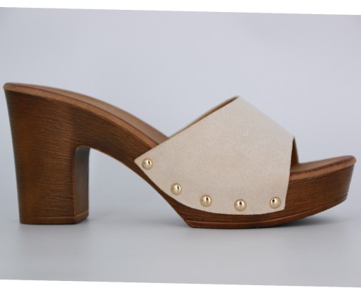 BEŻOWE DREWNIAKI NA OBCASIE KLAPKI DAMSKIE ZAMSZOWE Z ĆWIEKAMI