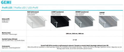 Profil aluminiowy typ GEMI przeznaczony jest do montażu wpuszczanego, o szerokim spektrum zastosowań. Doskonale nadaje się do stosowania jako element podświetleń dekoracyjnych w meblarstwie oraz wykroczeniach wnętrz. W profilu typu GEMI możemy zastosować 2 paski LED.
