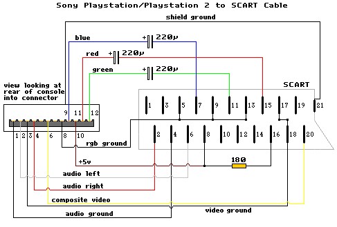 - oferowane kable wysyłają sygnał AV, można przerobić go na RGB wlutowując rezystor 180 Ohm pomiędzy PIN 8 i 16
