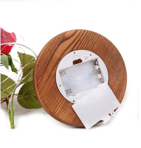 Czerwona róża w szkle z zielonymi listkami, z białym ciepłym stałym oświetleniem LED na baterie (dołączone), na jasnej drewnianej podstawce.