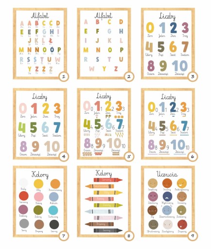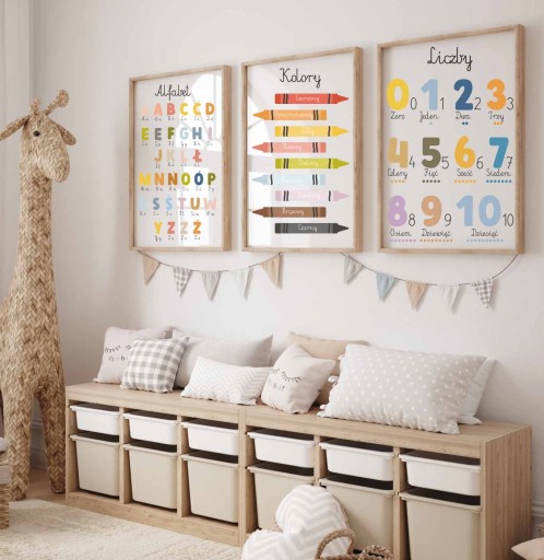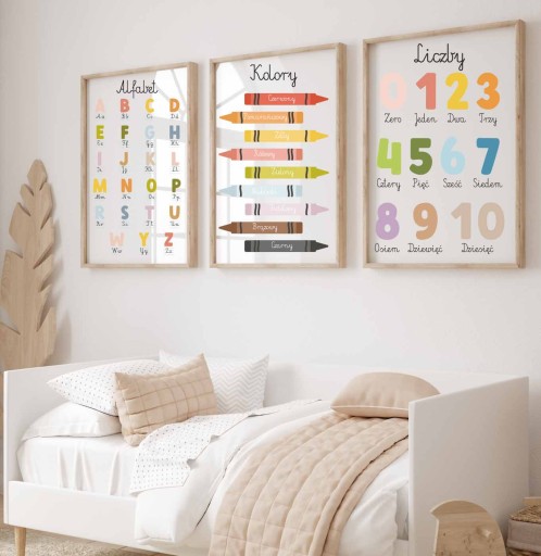 Zestaw 3 plakaty A4 MONTESSORI EDUKACYJNE Alfabet Kolory Liczby Różne wzory