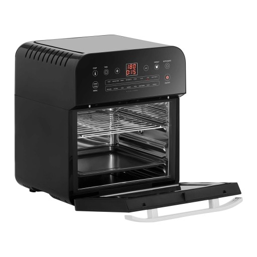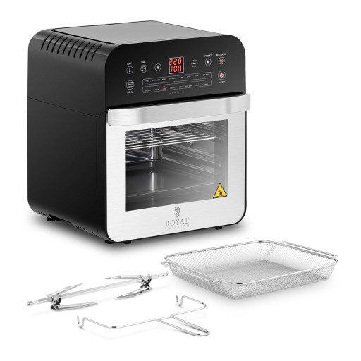Piekarnik wielofunkcyjny marki Royal Catering to sprzęt zarówno dla gospodarstw domowych, jak i małych restauracji, barów szybkiej obsługi, bistro, stacji benzynowych itp. Piecyk o pojemności 12 l świetnie nadaje się do skrzydełek, zapiekanek, frytek i innych przekąsek. Wydajny piekarnik o dużej mocy 1600 W optymalnie wykorzystuje energię dzięki wentylatorowi oraz górnej grzałce. Łatwa obsługa to efekt wyposażenia w czytelny cyfrowy panel. Wyświetlacz LED pozwala na precyzyjne ustawienie parametrów. Timer działa w zakresie 0-60 minut, natomiast temperaturę ustawia się od 50 do 220°C. Piekarnik posiada 13 programów: do frytek, skrzydełek, steków, chipsów, ryb, warzyw, popcornu, kurczaka, ciasta, szaszłyków, pizzy, tostów i ciasteczek. Umożliwia także rozmrażanie, suszenie i utrzymywanie w cieple.