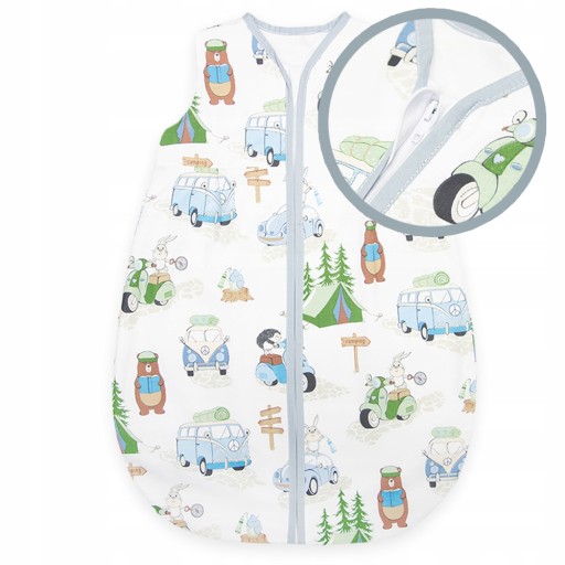 Tkanina zewnętrzna i wewnętrzna podszewka to wysokogatunkowa tkanina bawełniana 100%. Wygodny krój w kształcie gruszki zapewnia dziecku swobodę ruchów. Śpiworek zapinany jest na zamek błyskawiczny.