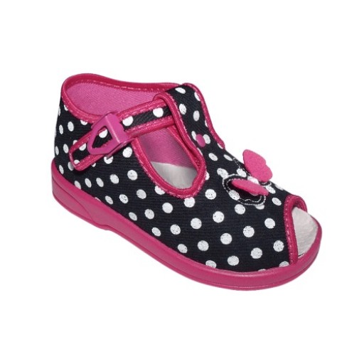 Obuwie dziecięce z odkrytymi paluszkami zapinane na dwie klamerki wykonane z szarej tkaniny w czarne kropki. Regulowane zapięcie pozwala dopasować buty do każdej stopy. Wnętrze buta wykonane z tkaniny bawełnianej. Usztywniana piętka. Różowa elastyczna podeszwa wykonana z bezftalanowego tworzywa. Wkładka wykonana z naturalnej skóry oraz elastycznej pianki. Pianka zawiera węgiel aktywny. Skóra absorbuje nadmiar wilgoci a węgiel aktywny pochłania nieprzyjemne zapachy zapewniając stopie uczucie świeżości.