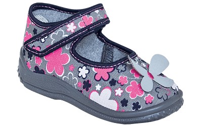 Obuwie dziecięce z odkrytymi paluszkami zapinane na dwie klamerki wykonane z szarej tkaniny w czarne kropki. Regulowane zapięcie pozwala dopasować buty do każdej stopy. Wnętrze buta wykonane z tkaniny bawełnianej. Usztywniana piętka. Różowa elastyczna podeszwa wykonana z bezftalanowego tworzywa. Wkładka wykonana z naturalnej skóry oraz elastycznej pianki. Pianka zawiera węgiel aktywny. Skóra absorbuje nadmiar wilgoci a węgiel aktywny pochłania nieprzyjemne zapachy zapewniając stopie uczucie świeżości.