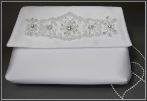 Komplet komunijny. Torebka z trzech warstw tkanin, satyny ślubnej, sztywnego tiulu i tkaniny cambel. Ozdobiona śliczną koronkową aplikacją z wyszywanymi perełkami, koralikami i cekinami oraz rękawiczki z małymi delikatnymi koralikami. Na pozostałych aukcjach można dopasować do nich okapnik na świece komunijne Na życzenie możemy przygotować rękawiczki zakładane na jeden paluszek.