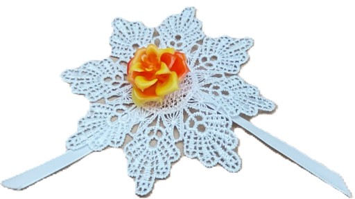 Kolor biały pełna gipiura z pomarańczowym cieniowanym kwiatkiem z dodatkiem żółtego.