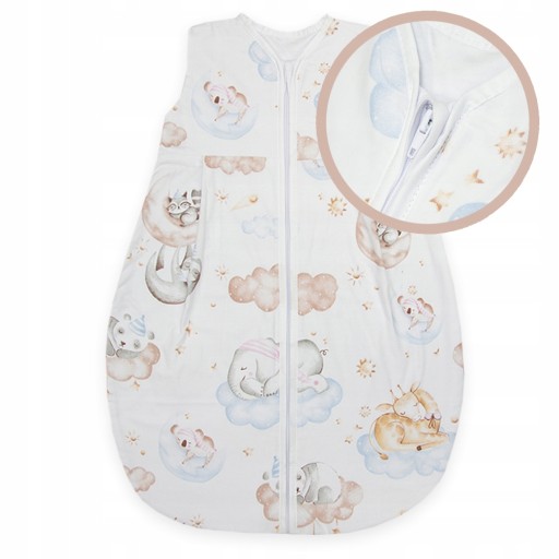 Tkanina zewnętrzna i wewnętrzna podszewka to wysokogatunkowa tkanina bawełniana 100%. Wygodny krój w kształcie gruszki zapewnia dziecku swobodę ruchów. Śpiworek zapinany jest na zamek błyskawiczny.