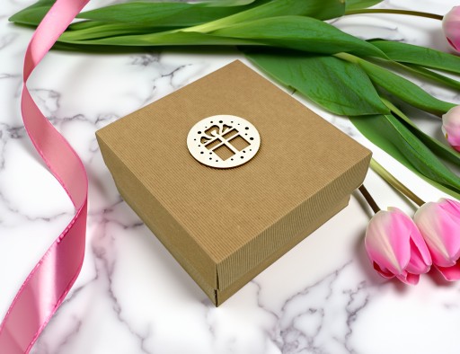 - dodatkowo na środku wieczka pudełka została umieszczona drewniana dekoracja wycinana laserowo w kształcie prezentu niespodzianki.