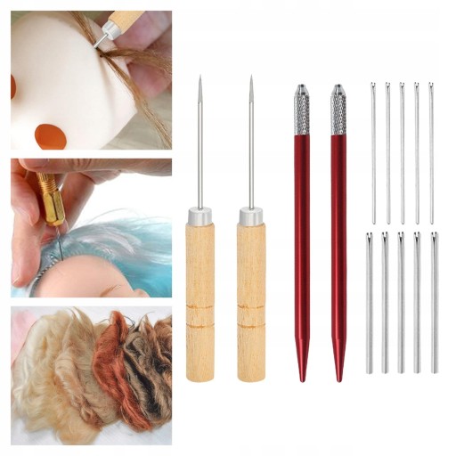 Pakiet zawiera: 2x uchwyty do ukorzeniania włosów, 10x igły do ukorzeniania włosów (3 kombinacje), 2x szydła. Zestaw narzędzi do ponownego ukorzeniania włosów dla lalek jest wygodny w użyciu. Zastosowanie: Nadaje się do ukorzeniania włosów lalek, projektowania fryzur, koronkowej peruki, peruka, zamykania, robienia peruk, koronkowych peruk z przodu i dodawania włosów do złych miejsc, naprawy linii włosów i innych prac rzemieślniczych, aby lalka miała piękne i lśniące włosy. Uwagi: Igły nieuchronnie ulegną uszkodzeniu w trakcie użytkowania. W procesie majsterkowania zachowaj ostrożność i cierpliwość i ciesz się zabawą z majsterkowania. Instrukcje: Umieść włosy na skórze lalki i obróć haczyk igłowy twarzą do włosów, następnie możesz zaczepić włosy i włożyć do skóry lalki. Na koniec wyciągnij igłę i powtórz ponownie. Materiał: Igły do filcowania igłami wykonane są ze stali nierdzewnej, twardej i niełatwej do złamania, ostrej i trwałej. Uchwyty do ukorzeniania włosów odpowiednie do salonu lub do użytku domowego. Tabela rozmiarów: Długość rękojeści: ok. 12 cm/4.72 cala Pakiet zawiera: 2-częściowe uchwyty do ukorzeniania włosów 10-częściowe igły do ukorzeniania włosów 2 sztuki szydła