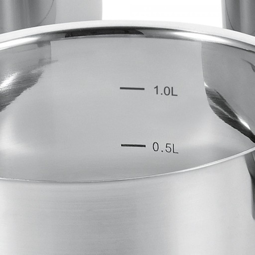 Powierzchnia zewnętrzna posiada lustrzane wykończenie z estetycznym satynowym pasem. Wewnętrzna powierzchnia w całości polerowana, zaopatrzona jest w podziałkę litrażową.