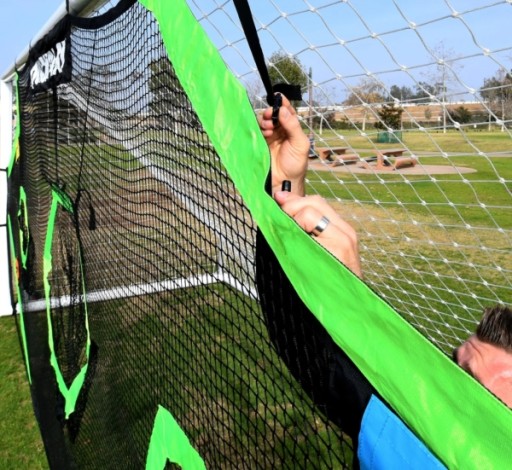 Mata pasuje na bramki o wymiarze 7,32 na 2,44 m i można ją łatwo zamocować za pomocą specjalnych gumek/zaczepów mocujących.
