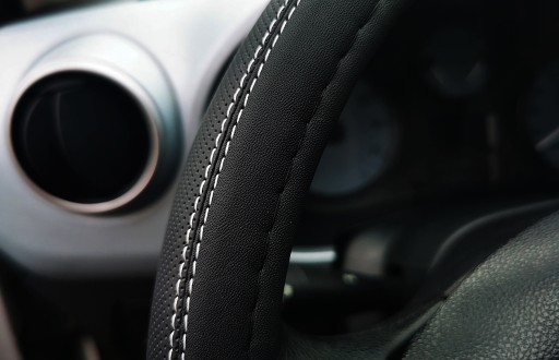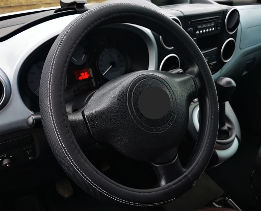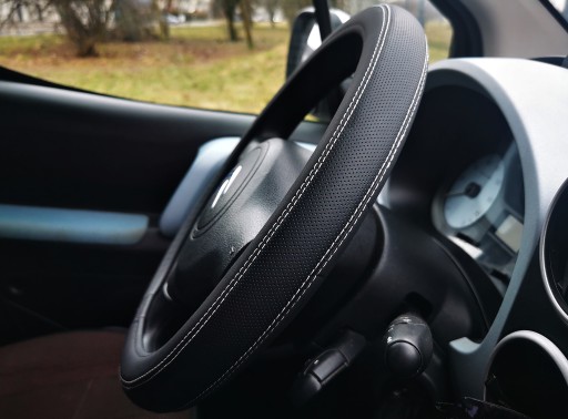Pokrowiec na kierownicę wykonany z wysokiej jakości ekoskóry perforowanej połączonej z ekoskórą gładką.