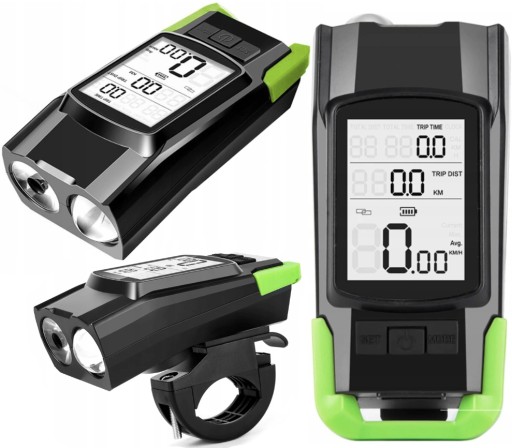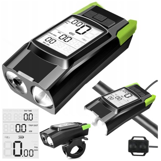 ✅ Wbudowany licznik działa bezprzewodowo, wyświetla takie parametry jak prędkość aktualną, średnią i maksymalną oraz dystans i czas jazdy. Posiada duży czytelny wyświetlacz, który pokazuje trzy różne parametry i jest dodatkowo podświetlany. Podczas jazdy wyświetlane są także spalone kalorie. Kolejnym ważnym atutem zestawu jest bardzo głośny klakson ostrzegawczy - siła dźwięku jest porównywalna z klaksonem samochodowym (120dB). Na pilocie znajduje się także przycisk do sterowania oświetleniem lampy.