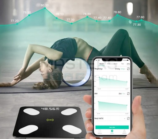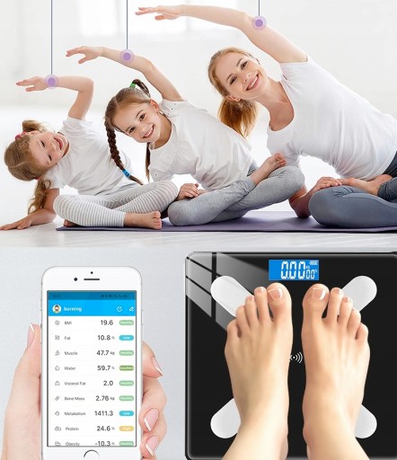 Dzięki wbudowanemu modułowi bluetooth waga po połączeniu z telefonem może dokonać szczegółowe pomiary: