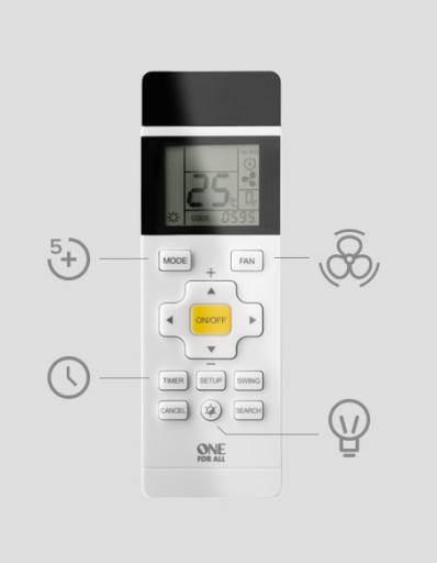 Idealne rozwiązanie, aby zastąpić zepsuty lub zgubiony pilot do klimatyzatora. Funkcje obejmują regulację prędkości wentylatora, tryby pracy, ustawienia nadmuchu i funkcję timera.