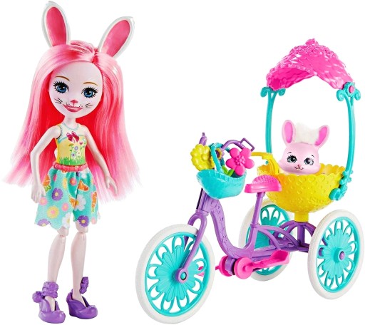 Daj się zabrać na baśniową przygodę do świata Enchantimals. Przyjaciółka Bree Bunny zabiera dzisiaj swojego przyjaciela Króliczka na przejażdżkę nowiutkim, trzykołowym rowerem. Wybierają się na piękną, kwiatową łączkę. Oczywiście Bree będzie kierowała i napędzała rower, a Króliczek będzie tylko pasażerem. Zwierzątko może podróżować w dużym koszyku przypiętym do siodełka, który ma daszek ochronny. Jeśli dziewczynka będzie chciała zabrać jeszcze więcej zwierzątek, to nie martwcie się. Do kosza zmieszczą się dwa zwierzątka, natomiast po odwróceniu daszku można zrobić z niego kolejny kosz/hamak dla kolejnych małych przyjaciół.