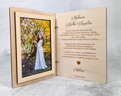 Przepiękna pamiątka z okazji Pierwszej Komunii Świętej. Drewniana otwierana kartka z ramką na zdjęcie i podziękowaniem dla dziadków.