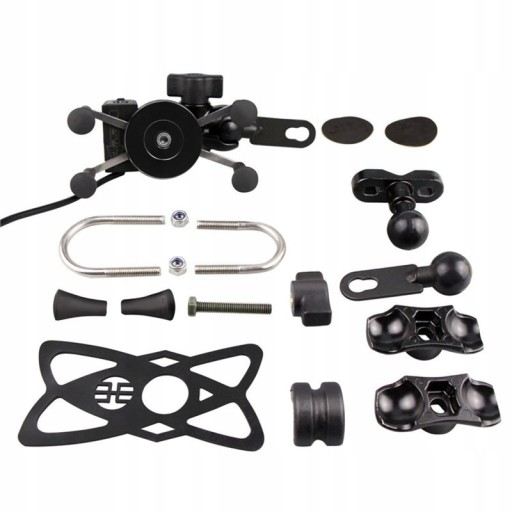 - Uchwyt typu X z 4 ramionami zakończonymi gumowymi chwytakami, ładowarką USB, włącznikiem i kablem