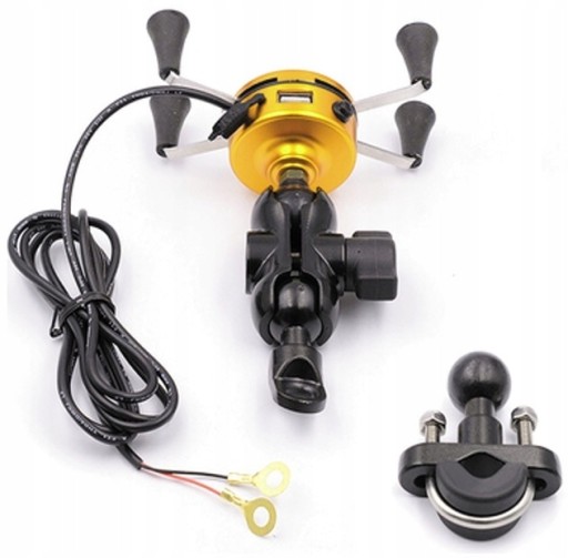 - Uchwyt typu X z 4 ramionami zakończonymi gumowymi chwytakami, ładowarką USB, włącznikiem i kablem