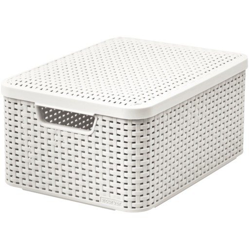 Kosz z pokrywką Rattan Style, w rozmiarze M, w kolorze kremowym. Elegancki, wytrzymały kosz marki Curver, do przechowywania akcesoriów w kuchni, łazience lub w szafie. Wykonany jest z wysokiej jakości tworzywa odpornego na wilgoć. Lekka, ażurowa konstrukcja imitująca plecionkę rattanową zapewnia cyrkulację powietrza. Wygodne, duże uchwyty ułatwią przenoszenie zapełnionego kosza. Połączenie praktycznego kształtu z estetycznym wyglądem pozwoliło stworzyć produkt idealny do każdego domu.