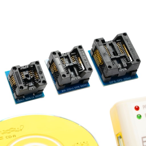 W skład zestawu wchodzą trzy adaptery, które umożliwiają programowanie wielu różnych pamięci przy różnych napięciach - 5V, 3,3V oraz 1,8V.