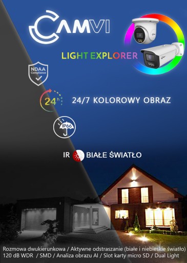 Kamera CV-IPB2428-DL-AI-G należy do serii kamer wykorzystujących innowacyjną technologię Daul Light - dzięki dwóm rodzajom oświetlaczy na pokładzie kamera umożliwia prowadzenie skutecznej obserwacji w nocy zarówno w trybie podczerwonym (czarno-białym) jak i w pełni kolorowym.