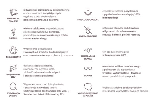 Regulacja temperatury: Włókno bambusa jest znane z doskonałych właściwości termoregulacyjnych, co oznacza, że nasza kołdra dostosowuje się do Twojej temperatury ciała, zapewniając chłodzenie w gorące dni i ciepło w chłodniejsze noce.