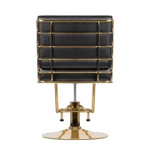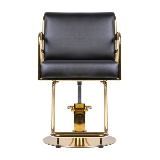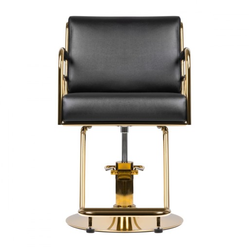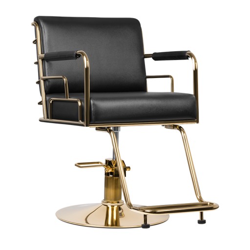Stylowy fotel fryzjerski. Bardzo komfortowy, idealnie pasujący do wnętrz eleganckich salonów. Regulowany w płaszczyźnie pionowej. Bardzo stabilny i solidny. Obicie z najwyższej jakości ekoskóry koloru czarnego. Dopełnieniem elegancji tego fotela jest złote wykończenie elementów metalowych. Powierzchnie metalowe lakierowane.