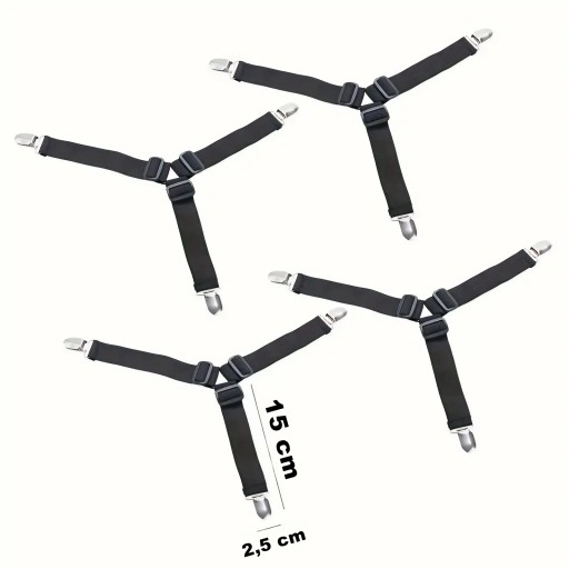 W opakowaniu znajdują się 4 zapięcia do prześcieradła, po jednym na każdy narożnik łóżka.