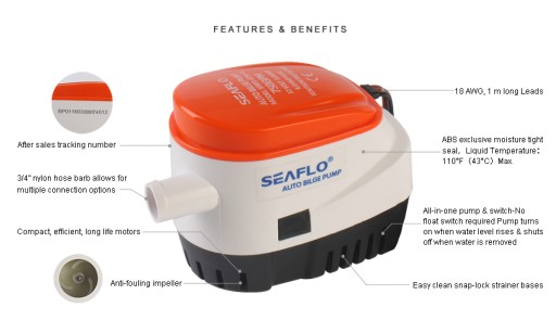 Seaflo SFBP1-G600-06 to automatyczna pompa zęzowa z napędem elektrycznym, zaopatrzona w sterownik pływakowy, który samoczynnie uruchomi urządzenie, gdy poziom wody w zęzie przekroczy dozwolony poziom i wyłączy ją po zakończeniu pompowania. Posiada również tester sprawności włącznika, który pozwala łatwo sprawdzić poprawność funkcjonowania pompy. Po zamontowaniu w zęzie i podłączeniu do zasilania DC 12V, urządzenie jest praktycznie bezobsługowe. Jest energooszczędna przy zachowaniu dobrej wydajności, na poziomie do 38 litrów na minutę i wysokości podnoszenia do 1,5 m. Obudowa wykonana z mocnego tworzywa ABS jest całkowicie uszczelniona i umożliwia bezpieczną pracę pompy w pełnym zanurzeniu. Podstawa pompy jest łatwa do zdemontowania, co ułatwia dostęp do otworu zasysającego wodę.