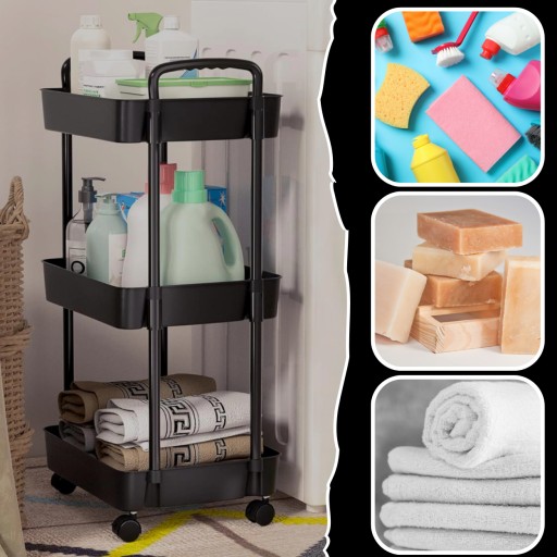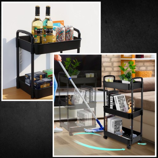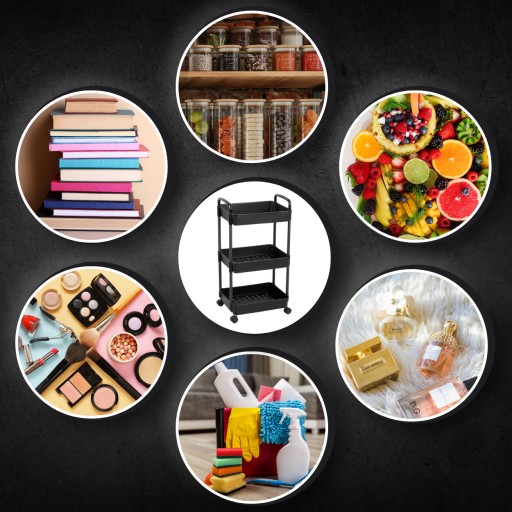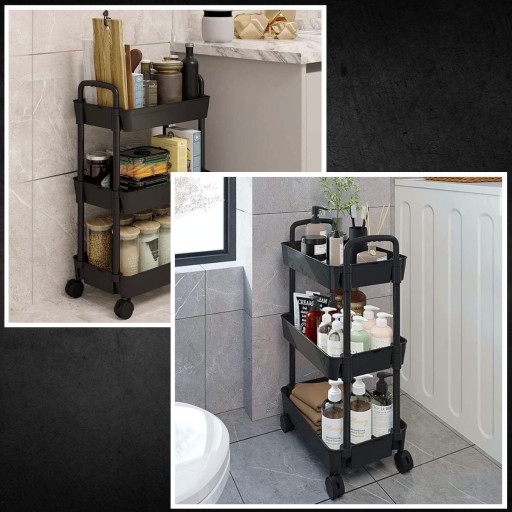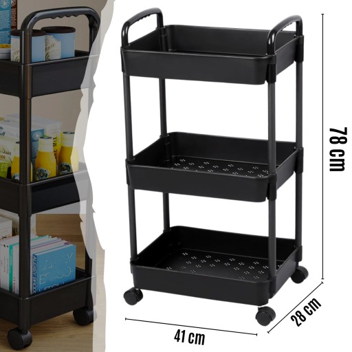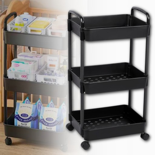 Uniwersalny regał idealnie nadający się do różnych pomieszczeń, takich jak kuchnia, łazienka, salon lub sypialnia, pozwala na zagospodarowanie wąskiej przestrzeni i ułatwia dostęp do potrzebnych przedmiotów. Regał posiada trzy półki, które pomieszczą wiele różnych akcesoriów, a także cztery kółka, z których dwa są blokowane hamulcem. W zestawie znajdują się również pięć haczyków, które mogą być zamontowane po lewej lub po prawej stronie na dowolnym poziomie.