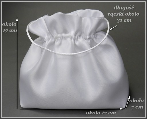 Torebka komunijna wykonana z satyny atłasowej odszyta na matową stronę. Torebka ozdobiona została atłasową kokardką z koronkową aplikacją z akcentem srebra i atłasową cienką rączką. Na pozostałych aukcjach można do torebki dokupić okapnik na świece komunijne i rękawiczki