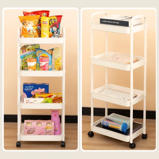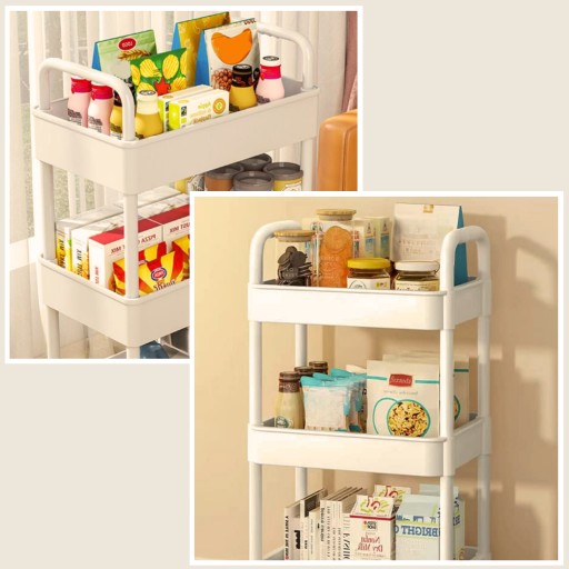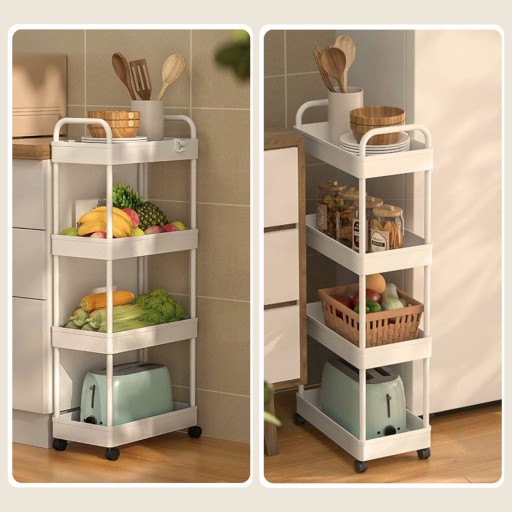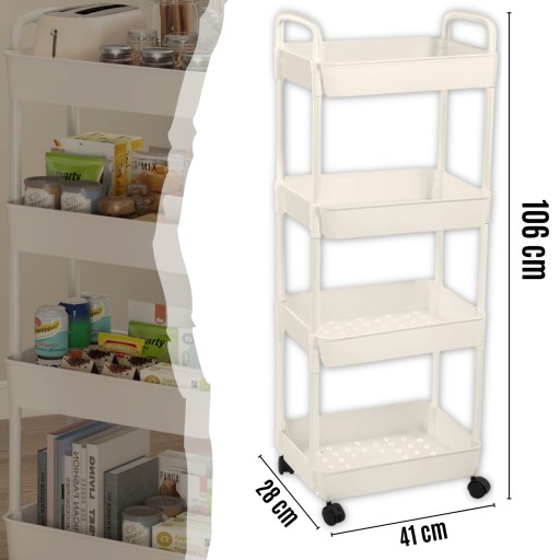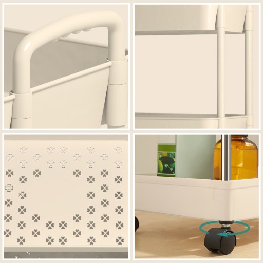 Uniwersalny regał idealnie nadający się do różnych pomieszczeń, takich jak kuchnia, łazienka, salon lub sypialnia, pozwala na zagospodarowanie wąskiej przestrzeni i ułatwia dostęp do potrzebnych przedmiotów. Regał posiada trzy półki, które pomieszczą wiele różnych akcesoriów, a także cztery kółka, z których dwa są blokowane hamulcem. W zestawie znajdują się również pięć haczyków, które mogą być zamontowane po lewej lub po prawej stronie na dowolnym poziomie.