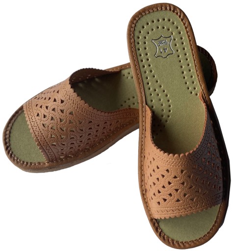 Pantofle ze skóry ekologicznej przeznaczone do użytku domowego.