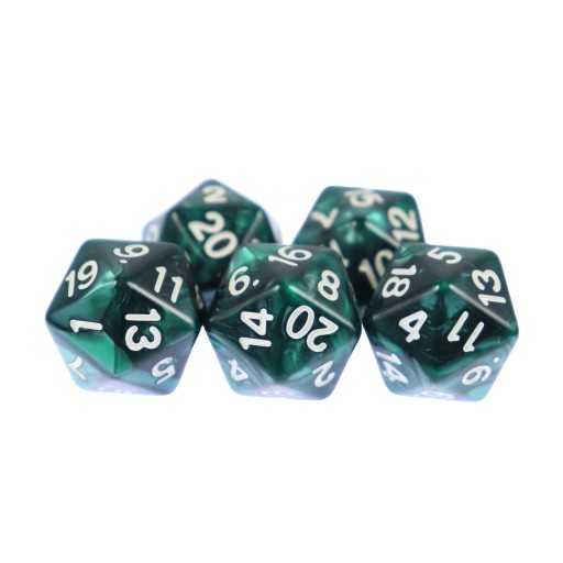 Komplet dwóch kości dwudziestościennych. Niezwykle wysoka jakość odlewu, precyzja żłobienia oraz malowania numerów czynią z nich podstawowy wybór dla wielu graczy, zarówno początkujących, jak i zaawansowanych.