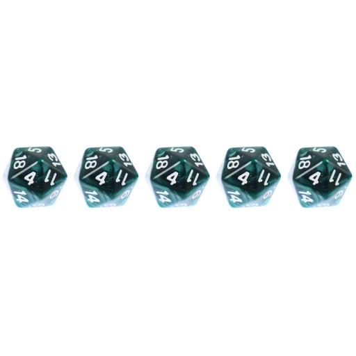 Komplet pięciu kości dwudziestościennych. Niezwykle wysoka jakość odlewu, precyzja żłobienia oraz malowania numerów czynią z nich podstawowy wybór dla wielu graczy, zarówno początkujących, jak i zaawansowanych.