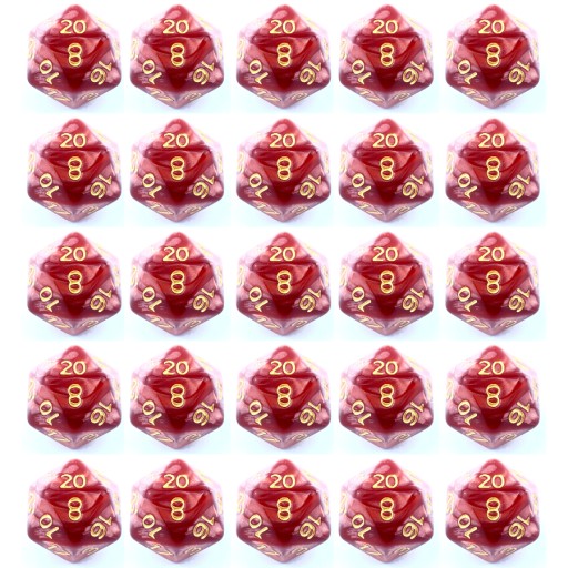 Komplet dwudziestu pięciu kości dwudziestościennych. Niezwykle wysoka jakość odlewu, precyzja żłobienia oraz malowania numerów czynią z nich podstawowy wybór dla wielu graczy, zarówno początkujących, jak i zaawansowanych.