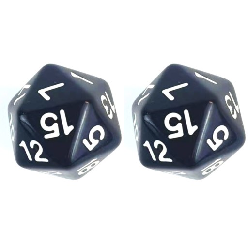 Komplet dwóch kości dwudziestościennych. Niezwykle wysoka jakość odlewu, precyzja żłobienia oraz malowania numerów czynią z nich podstawowy wybór dla wielu graczy, zarówno początkujących, jak i zaawansowanych.